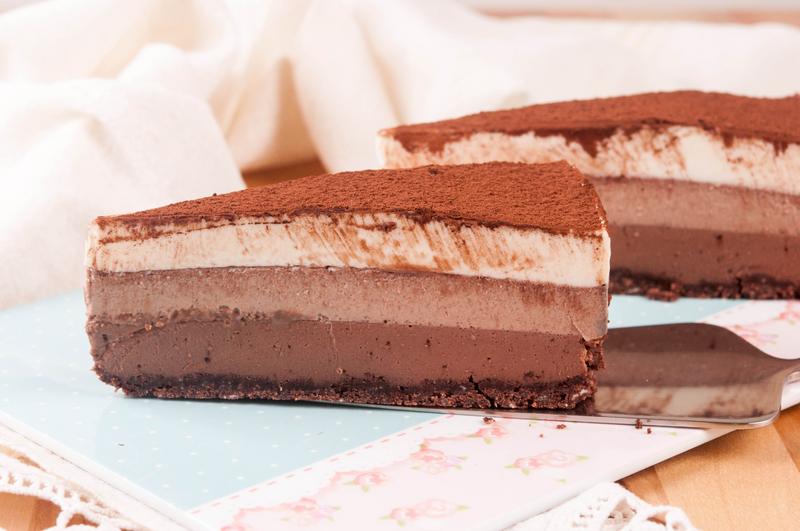 - След като първият шоколадов блат е вече стегнал, пригответе втория по същия начин. В затоплената смес от мляко и сметана, добавяте нарязания на ситно млечен шоколад, както и набъбналия желатин. Разбърквате много добре и изсипвате върху върху блата и отново прибирате в хладилника. След още час-два приготвяте по същия начин и сместа с белия шоколад и оставяте така получената торта да стегне за няколко часа или една нощ. По желание поръсвате тортата с какао.